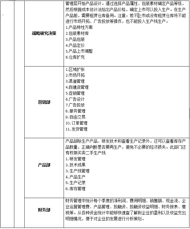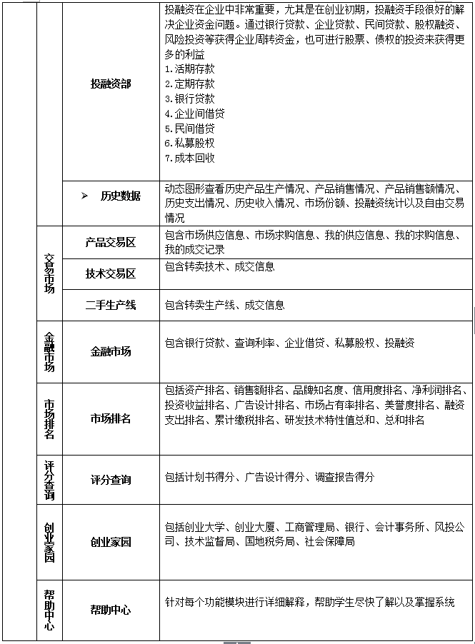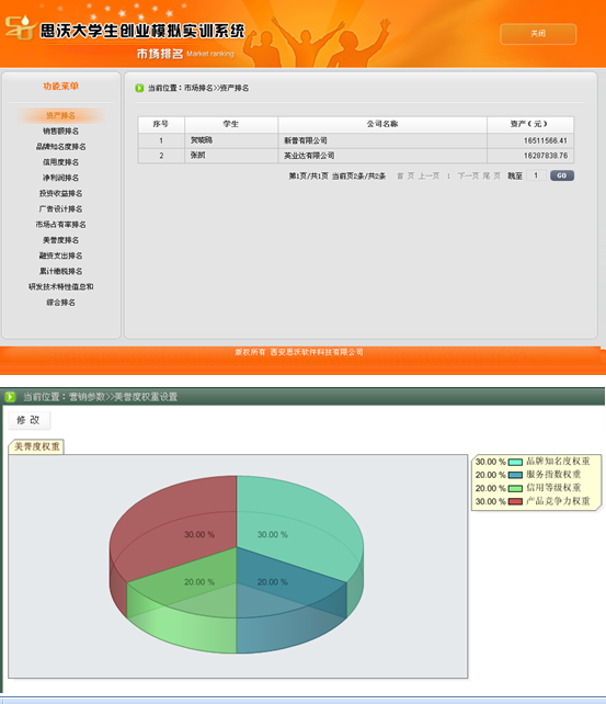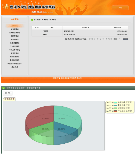 5、系統具有自動計(ji)分和手動評分功能。自動計(ji)分以各(ge)方(fang)面(mian)排(pai)(pai)(pai)名(ming)(ming)(ming)(ming)(ming)的形式(shi),包括資(zi)金(jin)排(pai)(pai)(pai)名(ming)(ming)(ming)(ming)(ming)、銷售排(pai)(pai)(pai)名(ming)(ming)(ming)(ming)(ming)、知名(ming)(ming)(ming)(ming)(ming)度排(pai)(pai)(pai)名(ming)(ming)(ming)(ming)(ming)、利潤排(pai)(pai)(pai)名(ming)(ming)(ming)(ming)(ming)、投資(zi)收(shou)益(yi)排(pai)(pai)(pai)名(ming)(ming)(ming)(ming)(ming)、廣告設(she)計(ji)排(pai)(pai)(pai)名(ming)(ming)(ming)(ming)(ming)、市(shi)(shi)場占有率排(pai)(pai)(pai)名(ming)(ming)(ming)(ming)(ming)、美(mei)譽度排(pai)(pai)(pai)名(ming)(ming)(ming)(ming)(ming)、投融資(zi)收(shou)益(yi)排(pai)(pai)(pai)名(ming)(ming)(ming)(ming)(ming)、累計(ji)繳(jiao)稅排(pai)(pai)(pai)名(ming)(ming)(ming)(ming)(ming)、綜(zong)合排(pai)(pai)(pai)名(ming)(ming)(ming)(ming)(ming)等。教師可以批閱學生所(suo)提交的計(ji)劃書(shu)、廣告設(she)計(ji)、市(shi)(shi)場調查分析、公(gong)司制度等。