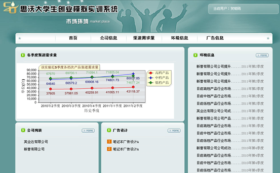 思沃大(da)(da)(da)學(xue)(xue)生(sheng)(sheng)創(chuang)(chuang)業(ye)(ye)模(mo)(mo)(mo)擬(ni)實訓平臺(tai)系統從大(da)(da)(da)學(xue)(xue)生(sheng)(sheng)創(chuang)(chuang)業(ye)(ye)的(de)(de)現狀分析,將創(chuang)(chuang)業(ye)(ye)教育的(de)(de)內(nei)容以及因(yin)素滲透(tou)在(zai)(zai)(zai)專業(ye)(ye)實踐教學(xue)(xue)中(zhong)(zhong),并(bing)根據(ju)創(chuang)(chuang)業(ye)(ye)教育的(de)(de)目標(biao)及內(nei)容設置較完(wan)善的(de)(de)創(chuang)(chuang)業(ye)(ye)實踐體(ti)系。軟件(jian)模(mo)(mo)(mo)擬(ni)交互(hu)思想,采(cai)用(yong)國(guo)際先(xian)進的(de)(de)計算(suan)機仿(fang)真(zhen)(zhen)技(ji)術,仿(fang)真(zhen)(zhen)模(mo)(mo)(mo)擬(ni)虛擬(ni)市(shi)場(chang)(chang)(chang)環(huan)境、市(shi)場(chang)(chang)(chang)調查以及整個(ge)市(shi)場(chang)(chang)(chang)競爭結構。學(xue)(xue)生(sheng)(sheng)通(tong)(tong)過(guo)軟件(jian)學(xue)(xue)習創(chuang)(chuang)業(ye)(ye)心理學(xue)(xue)、創(chuang)(chuang)業(ye)(ye)講(jiang)堂、網(wang)上創(chuang)(chuang)業(ye)(ye)、創(chuang)(chuang)業(ye)(ye)準備等創(chuang)(chuang)業(ye)(ye)知識,撰寫(xie)一(yi)份創(chuang)(chuang)業(ye)(ye)計劃書,投(tou)入到創(chuang)(chuang)業(ye)(ye)實戰(zhan)(zhan)中(zhong)(zhong)。創(chuang)(chuang)業(ye)(ye)實戰(zhan)(zhan)分為(wei)公(gong)(gong)司(si)注(zhu)(zhu)冊和實戰(zhan)(zhan)運營(ying)。公(gong)(gong)司(si)注(zhu)(zhu)冊采(cai)用(yong)Flash動畫模(mo)(mo)(mo)式,模(mo)(mo)(mo)擬(ni)公(gong)(gong)司(si)注(zhu)(zhu)冊的(de)(de)整個(ge)流程。實戰(zhan)(zhan)運營(ying)是整個(ge)系統的(de)(de)主(zhu)體(ti),將全國(guo)分為(wei)七個(ge)區(qu)域(yu):東北(bei)地(di)區(qu)、華北(bei)地(di)區(qu)、西北(bei)地(di)區(qu)、華東地(di)區(qu)、西南(nan)地(di)區(qu)、華中(zhong)(zhong)地(di)區(qu)、華南(nan)地(di)區(qu)。系統模(mo)(mo)(mo)擬(ni)公(gong)(gong)司(si)內(nei)部與外在(zai)(zai)(zai)市(shi)場(chang)(chang)(chang)之間的(de)(de)矛盾,創(chuang)(chuang)業(ye)(ye)者通(tong)(tong)過(guo)各種(zhong)調查、決策解決企業(ye)(ye)市(shi)場(chang)(chang)(chang)運營(ying)過(guo)程中(zhong)(zhong)可能遇(yu)到的(de)(de)各種(zhong)情況。在(zai)(zai)(zai)區(qu)域(yu)需求飽和后擴大(da)(da)(da)市(shi)場(chang)(chang)(chang),對其中(zhong)(zhong)出現的(de)(de)問題和運營(ying)結果進行分析與評估,培養大(da)(da)(da)學(xue)(xue)生(sheng)(sheng)正確的(de)(de)人生(sheng)(sheng)觀(guan)、價值觀(guan)、就業(ye)(ye)觀(guan),提高大(da)(da)(da)學(xue)(xue)生(sheng)(sheng)勇于創(chuang)(chuang)業(ye)(ye)的(de)(de)精(jing)神,讓大(da)(da)(da)學(xue)(xue)生(sheng)(sheng)有良好的(de)(de)創(chuang)(chuang)業(ye)(ye)意識,增強大(da)(da)(da)學(xue)(xue)生(sheng)(sheng)自主(zhu)創(chuang)(chuang)業(ye)(ye)能力。